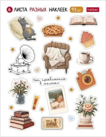 Набор наклеек в пакете с европодвесом. Состоит из 4-х листов А6 формата размером 115 х150мм. Наклейки на бумажной основе, не влагостойкие.Наклейки подходят для оформления открыток, подарков, украшения рисунков, страниц в дневниках и блокнотах, и просто всего, что вам нравится - возможности безграничны.Наклейки позволят воплотить разные замыслы и с удовольствием погрузиться в творческий процесс.