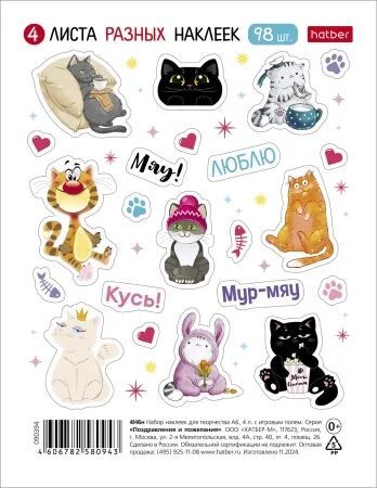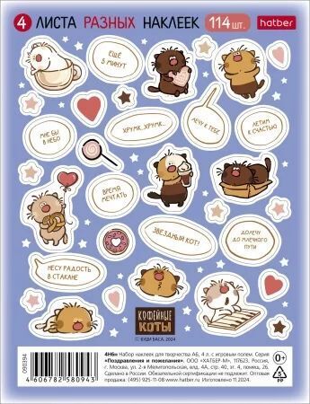 Набор наклеек в пакете с европодвесом. Состоит из 4-х листов А6 формата размером 115 х150мм. Наклейки на бумажной основе, не влагостойкие.Наклейки подходят для оформления открыток, подарков, украшения рисунков, страниц в дневниках и блокнотах, и просто всего, что вам нравится - возможности безграничны.Наклейки позволят воплотить разные замыслы и с удовольствием погрузиться в творческий процесс.