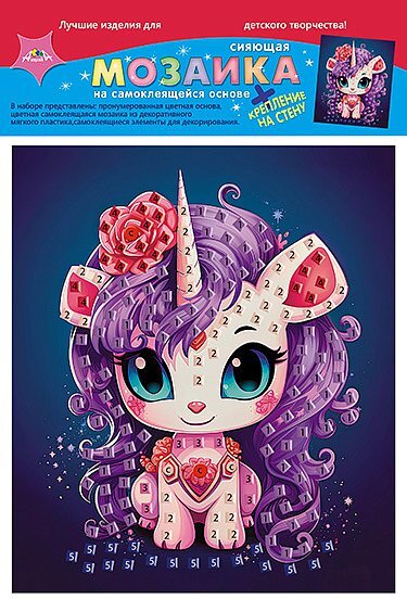 На цветной картонной основе числами и цветом показаны места куда необходимо приклеить элементы мозаики. Элементы имеют клеевой слой, поэтому вы обойдетесь без клея и ножниц. В результате получится яркая картинка, которую отлично дополнят глазки и стразы. Все необходимые детали для поделки входят в состав набора.
