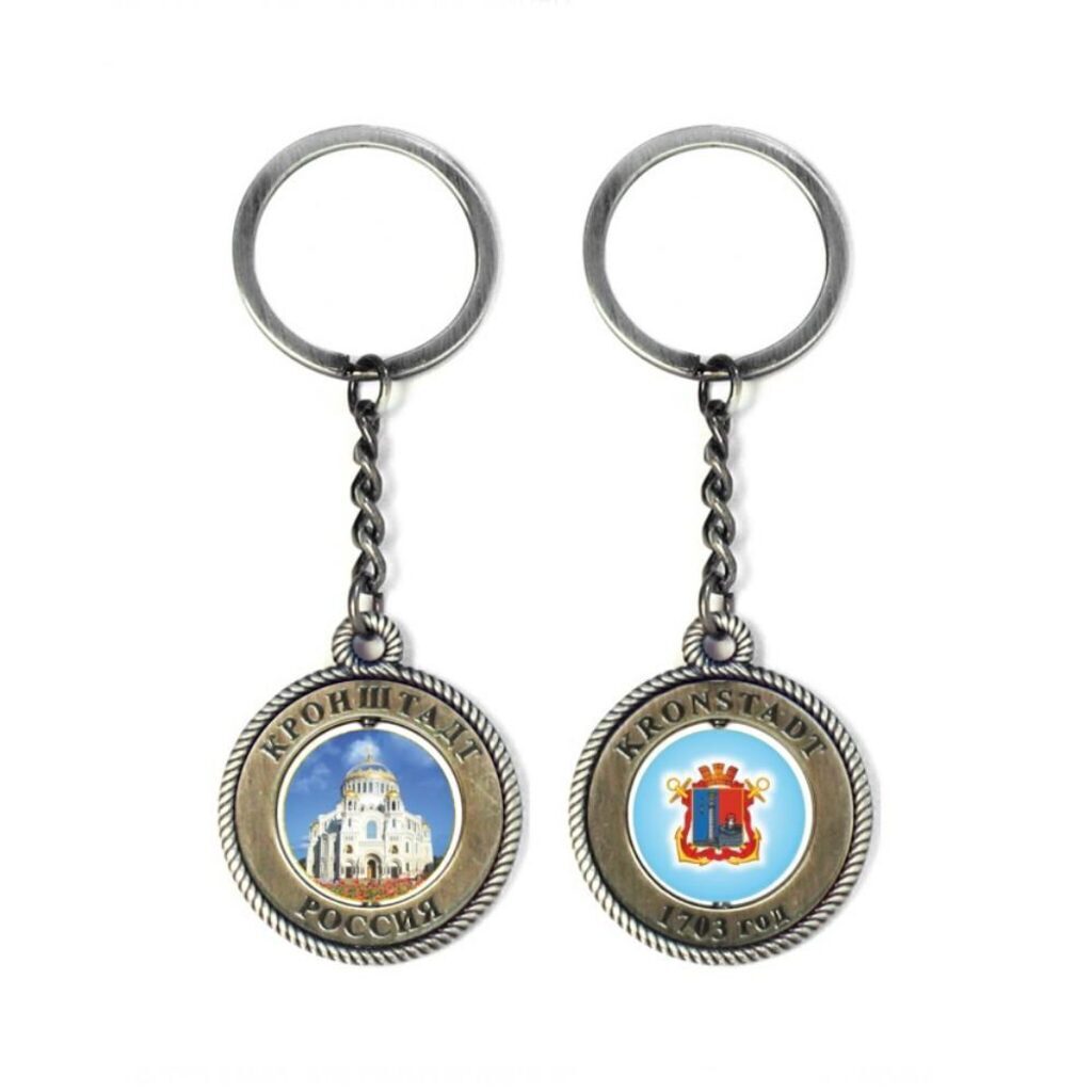 Металлический брелок в форме ключа от города. Внутри фигурная вставка- Кронштадт. Морской Никольский Собор. - Герб