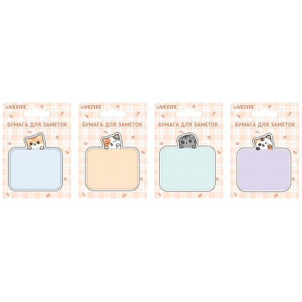 Клейкая бумага для заметок "deVENTE. Fanny Cats" 70x70 мм, 30 листов, офсет 80 г/м², печать 1+0, ассорти форм и дизайнов, в картонном блистере и пластиковом пакете с европодвесом