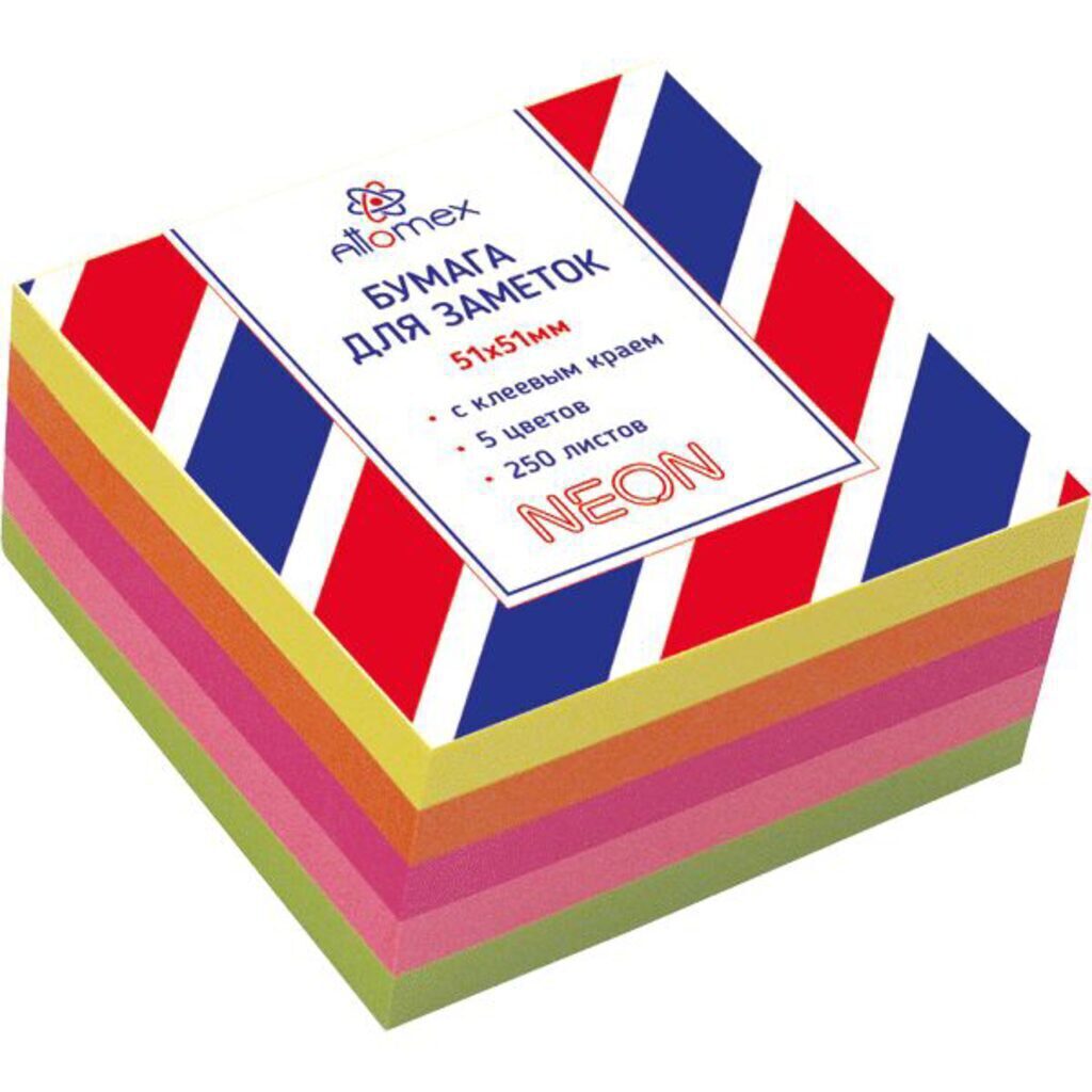 Клейкая бумага для заметок "Attomex" 51x51 мм, 250 листов, офсет 75 г/м?, 5 неоновых цветов