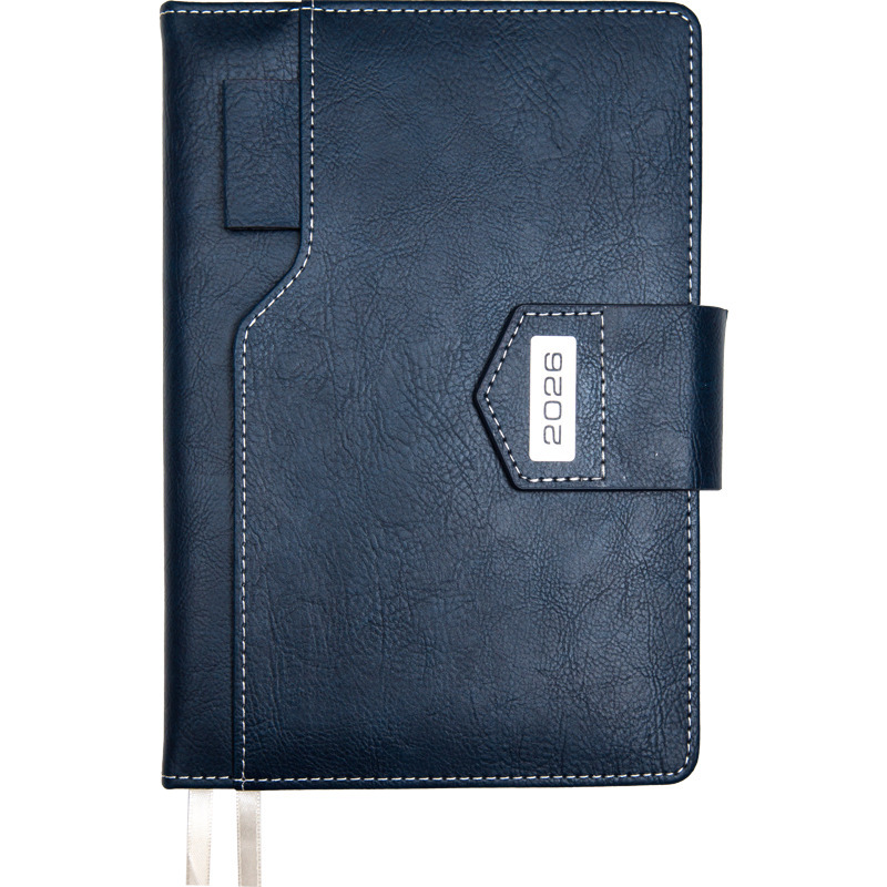Ежедневник датированный 2026 "deVENTE. Prestige" A5 (145 ммx205 мм) 336 стр, белая бумага 70 г/м², печать в 2 краски, твердая обложка из искусственной кожи с поролоном, карман для телефона и визиток, держатель для ручки, магнитная створка, черный форзац, отстрочка, тиснение фольгой, перфорация, закругленные уголки, 2 ляссе, в подарочной коробке, синий