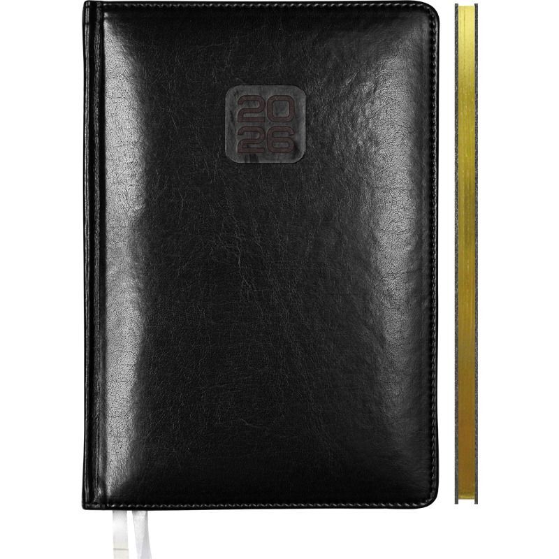Еженедельник датированный 2026 "deVENTE. Bravo" A4 (210 ммx290 мм) 128 стр, белая бумага 70 г/м² с золотым срезом, печать в 2 краски, твердая обложка из искусственной кожи с поролоном, отстрочка, термо тиснение, перфорация, закругленные уголки, 2 ляссе, в термоусадочной пленке, черный