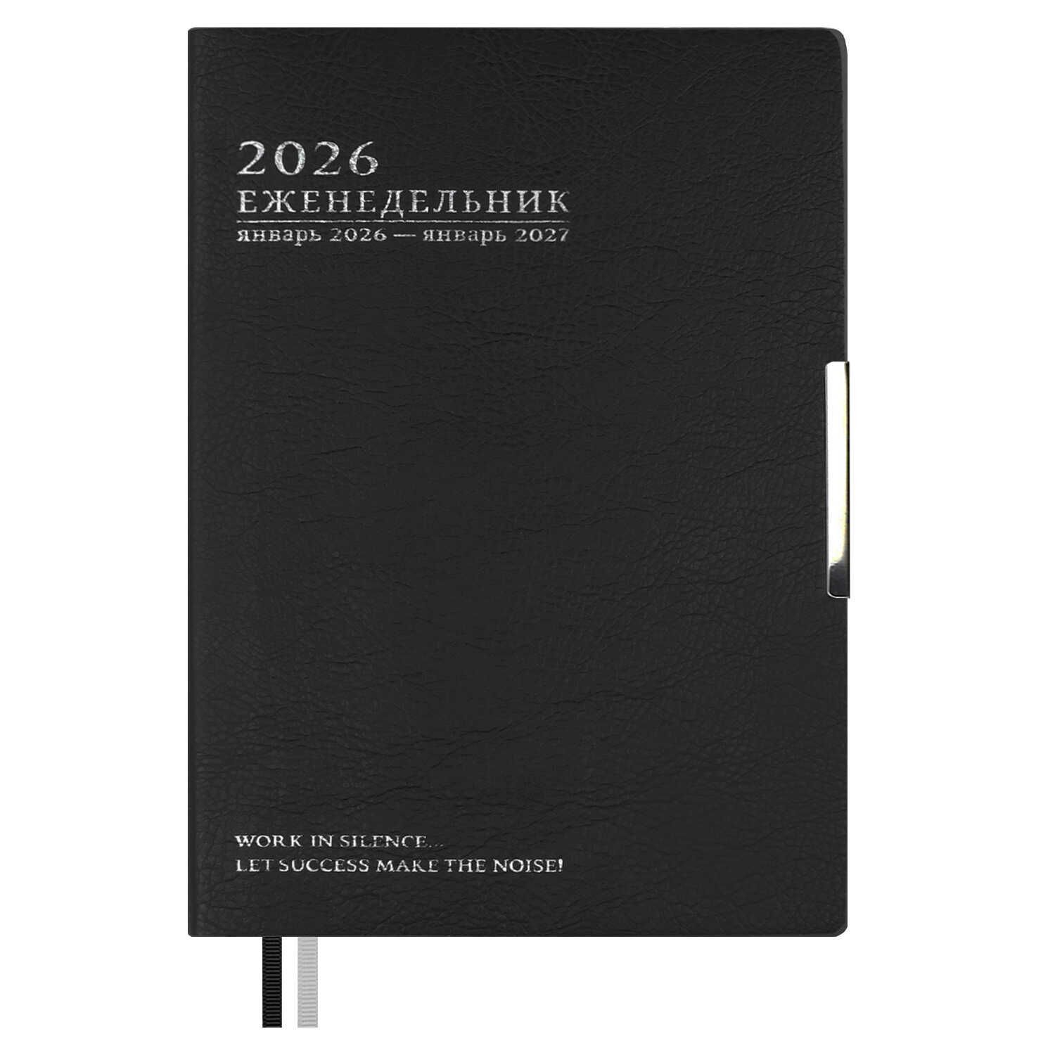 Еженедельник дат. 2026г А6 80л., кожзам., мягк.пер. "Шеврет глосс черный" тисн.фольгой, ляссе