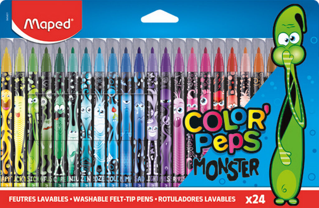 845401 COLOR'PEPS MONSTER Фломастеры с заблокированным пишущим узлом, средний пишущий узел, смываемые, декорированные, в картонном футляре, 24 цвета