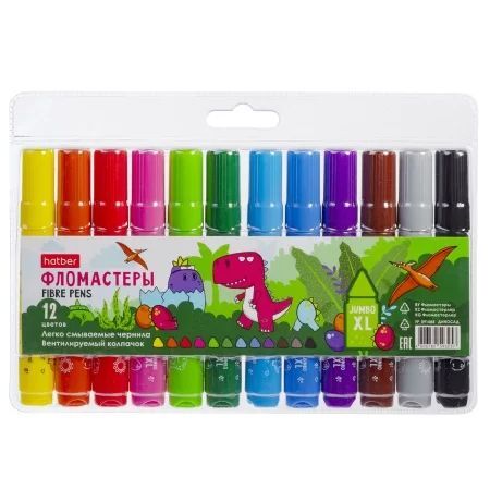 Фломастеры Hatber JUMBO-XL ДИНОСАД 12 цветов с одним из самых толстых корпусов в своём классе - диаметром 19мм.Утолщённая форма корпуса, позволяет ребёнку удобно держать фломастер в руке. Корпус из полипропилена устойчив к разлому, - безопасен при попытке сломать. Чернила фломастеры изготовлены на водной основе, не имеет запаха, безопасны, легко смываются с рук и одежды с помощью воды и мыла. Штрихи и линии не проступают на обратную сторону листа. Толстый наконечник, диаметром 6мм, выдерживает сильный нажим и не проваливается внутрь корпуса.Колпачок имеет специальные прорези для вентиляции, которые способствуют прохождению воздуха при случайном попадании в дыхательные пути ребёнка. При этом колпачок плотно закрывается, обеспечивая долгий срок службы фломастера.