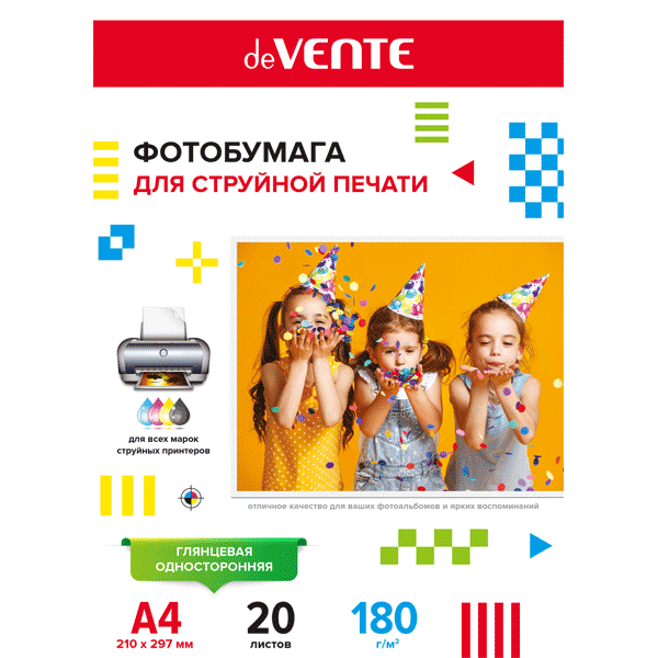 Фотобумага для струйной печати "deVENTE" A4, 20 л, 180 г/м?, глянцевая односторонняя, в пластиковом пакете с европодвесом