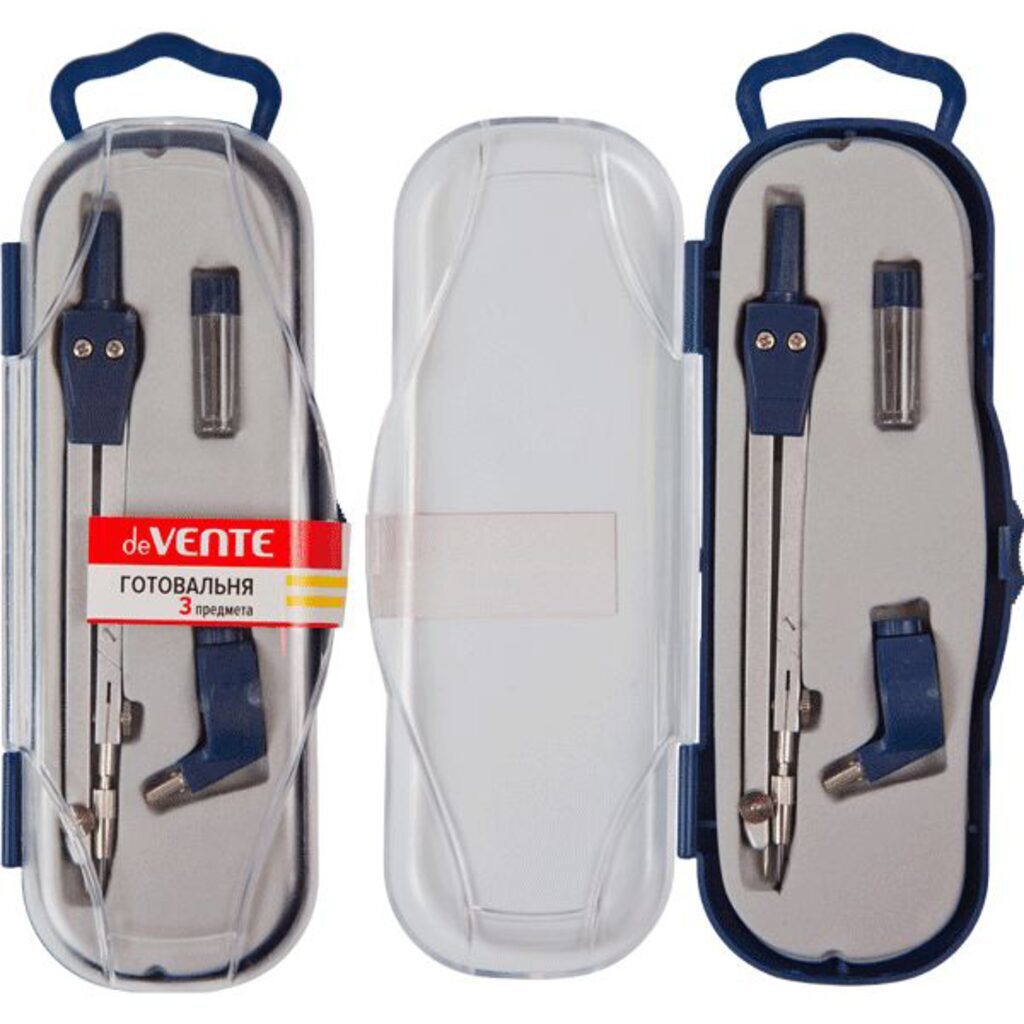 Готовальня "deVENTE" 3 предмета В набор входит: циркуль, насадка с универсальным держателем, грифель в пенале. Материал: цинк, длина циркуля: 13,5 см, макс. диаметр круга: 35 см, диаметр штифта: 3,5 мм. Цвет пластика: темно-синий