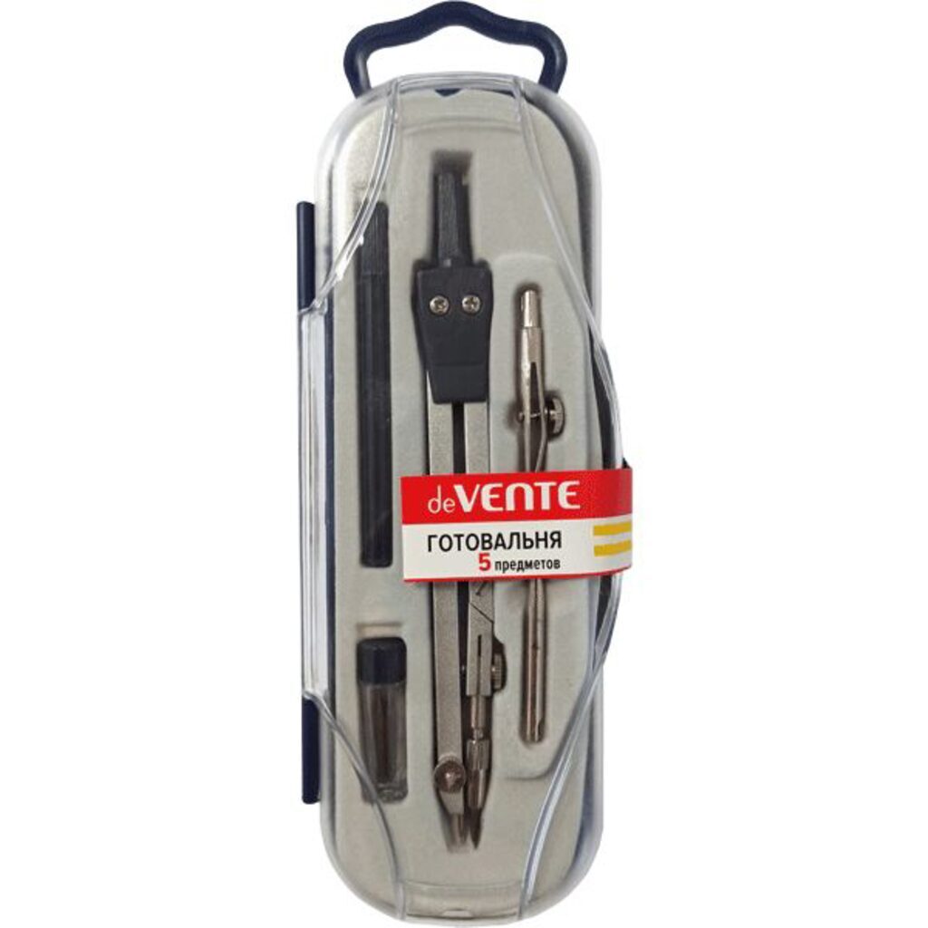 Готовальня "deVENTE" 5 предметов В набор входит: циркуль, рейсфедерная вставка, держатель для рейсфедерной вставки, игольная вставка, грифель в пенале. Материал: цинк, длина циркуля: 13,5 см, макс. диаметр круга: 35 см, диаметр штифта: 3,5 мм. Цвет пластика: темно-синий