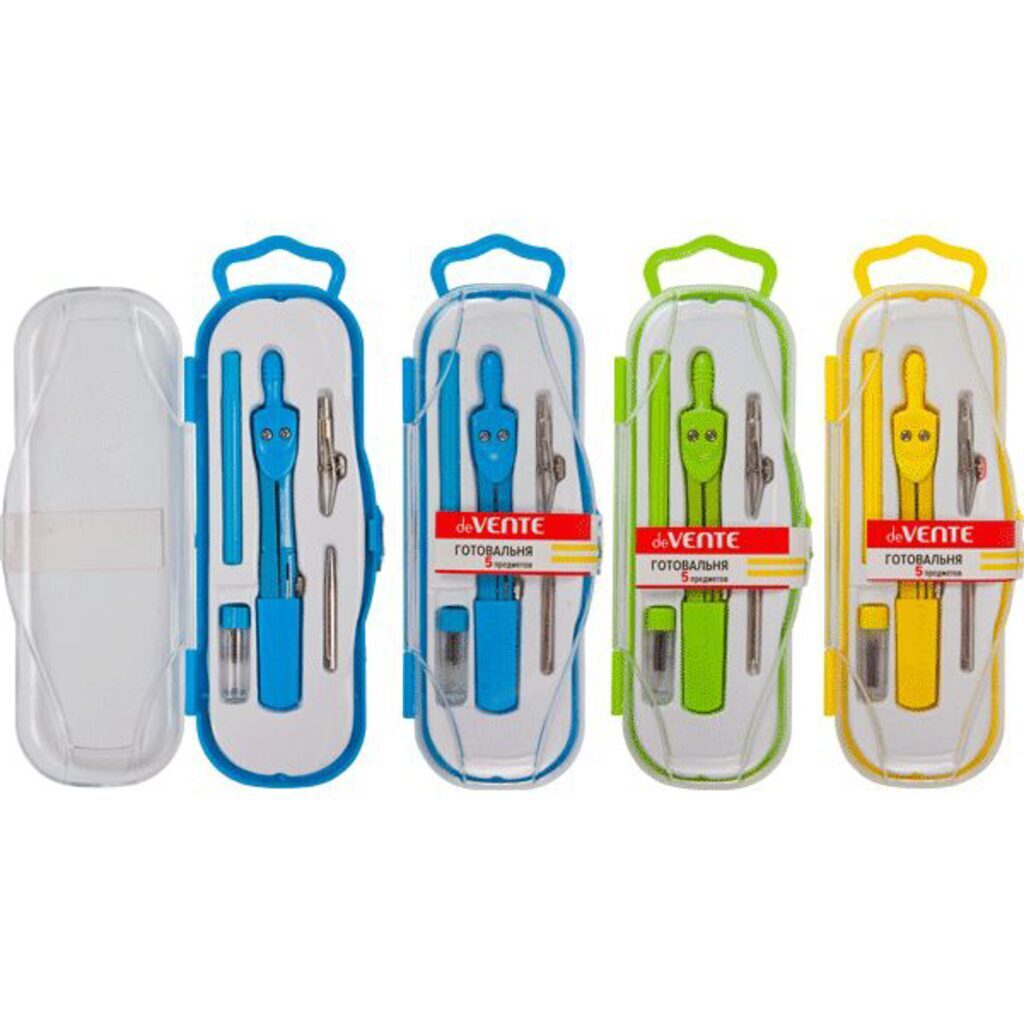 Готовальня "deVENTE" 5 предметов цветной корпус, В набор входит: циркуль, рейсфедерная вставка, держатель для рейсфедерной вставки, игольная вставка, грифель в пенале. Материал: цинк, длина циркуля: 12,5 см, макс. диаметр круга: 34 см, диаметр штифта: 3,5 мм. Цвет пластика: ассорти 3 цвета
