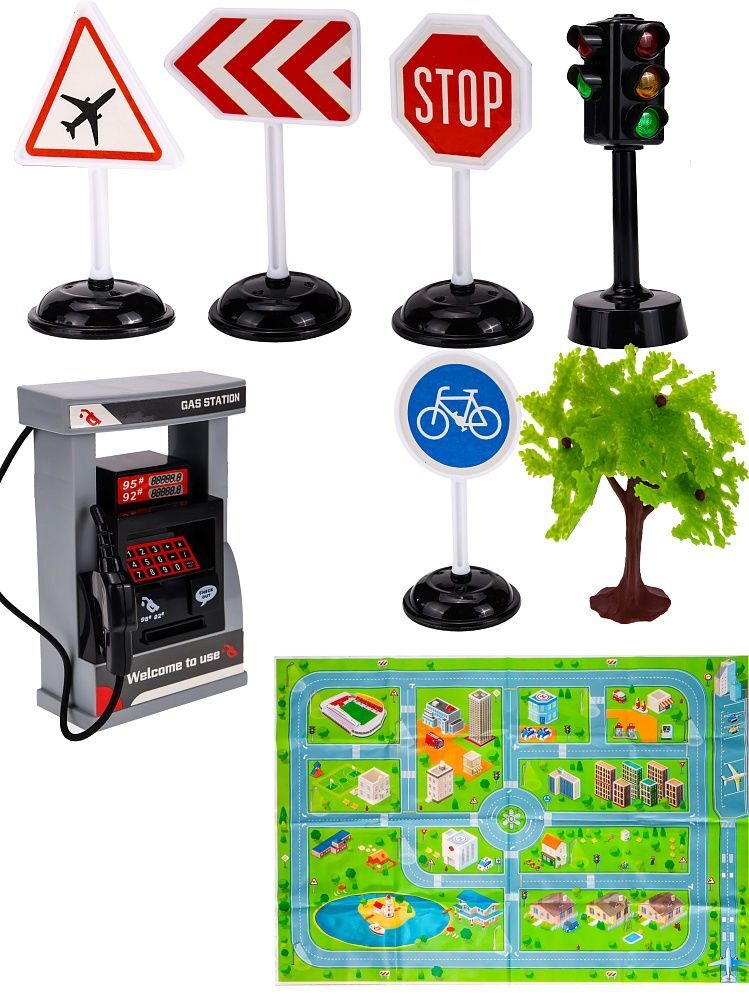 Игровой набор 8 предметов "Заправка" свет,звук, игр. поле,1 дерево,6*AG3