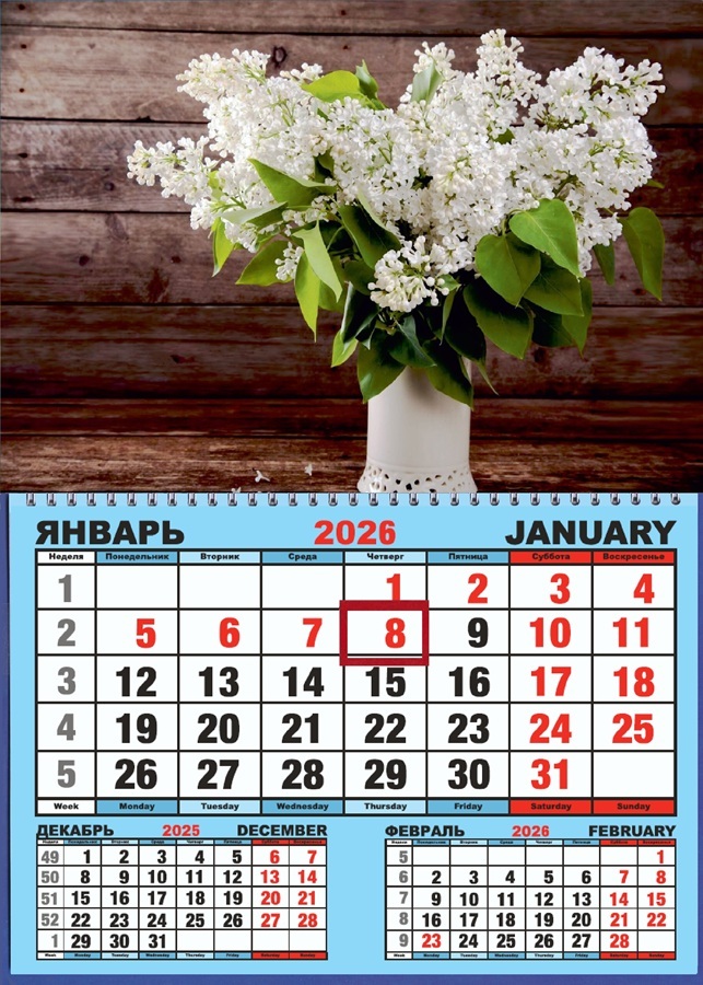 Календарь настенный 310*420мм на 2026г. ОДНОБЛОЧНЫЙ с курсором и календ.сеткой "Белая сирень"
