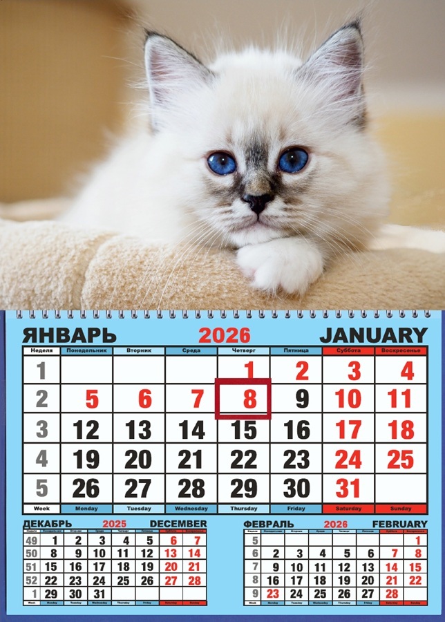 Календарь настенный 310*420мм на 2026г. ОДНОБЛОЧНЫЙ с курсором и календ.сеткой "Белый котёнок"