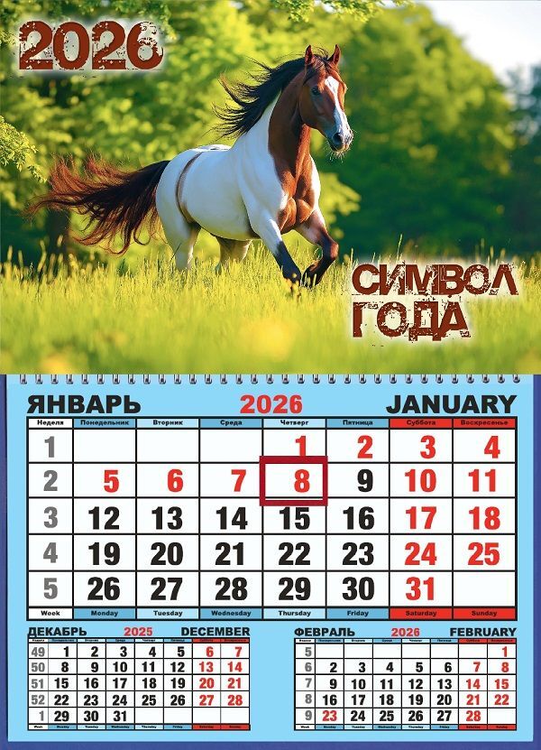 Календарь настенный 310*420мм на 2026г. ОДНОБЛОЧНЫЙ с курсором и календ.сеткой "Лошадь.Лето"