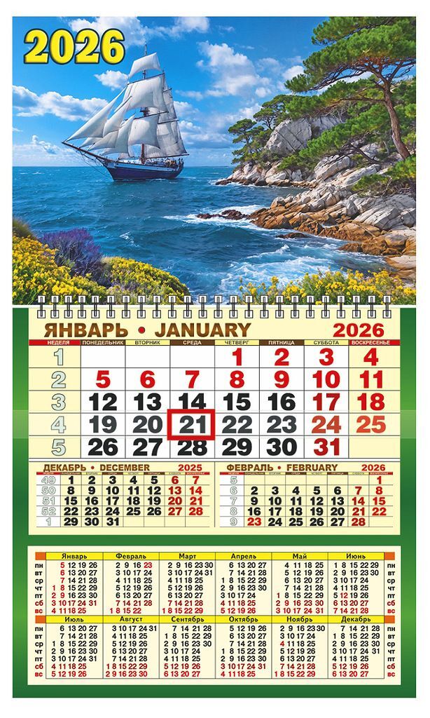 Календарь настенный 310*500мм на 2026г. ОДНОБЛОЧНЫЙ с курсором и календ.сеткой "Морской пейзаж"