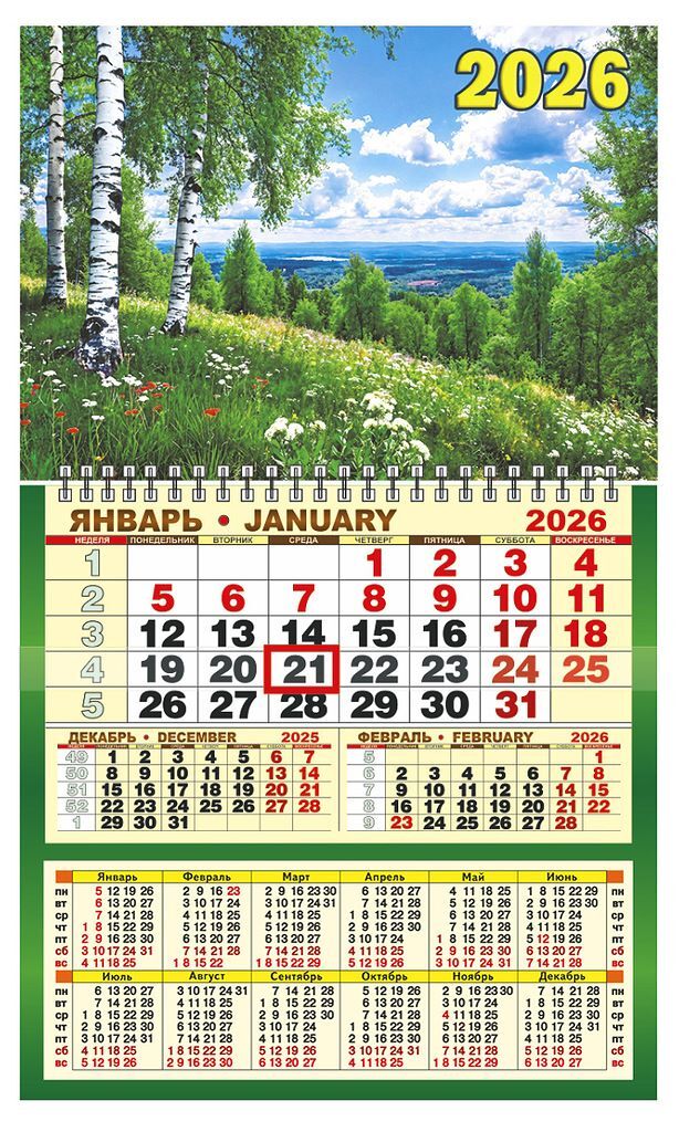 Календарь настенный 310*500мм на 2026г. ОДНОБЛОЧНЫЙ с курсором и календ.сеткой "На косогоре"