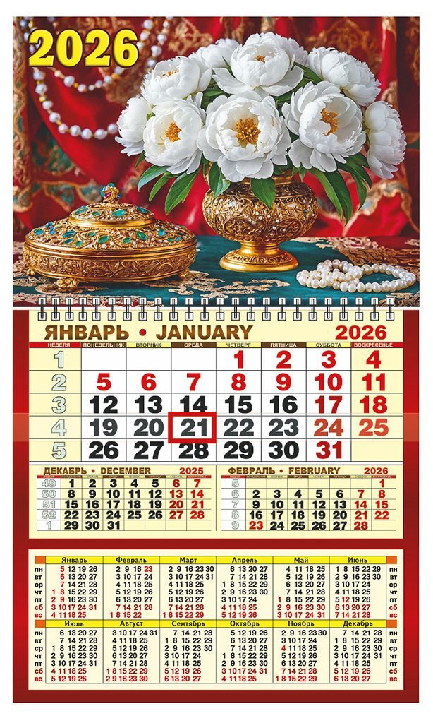 Календарь настенный 310*500мм на 2026г. ОДНОБЛОЧНЫЙ с курсором и календ.сеткой "Пионы"