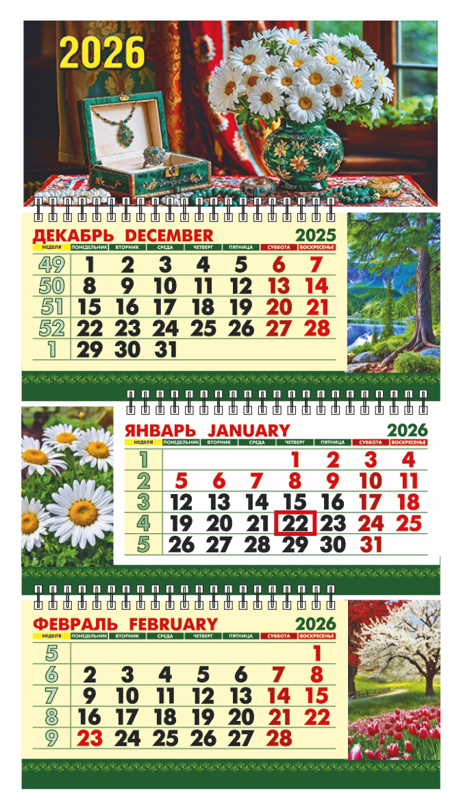 Календарь Трио Малый 246*450мм на 2026г. с курсором "Ромашки в вазе"
