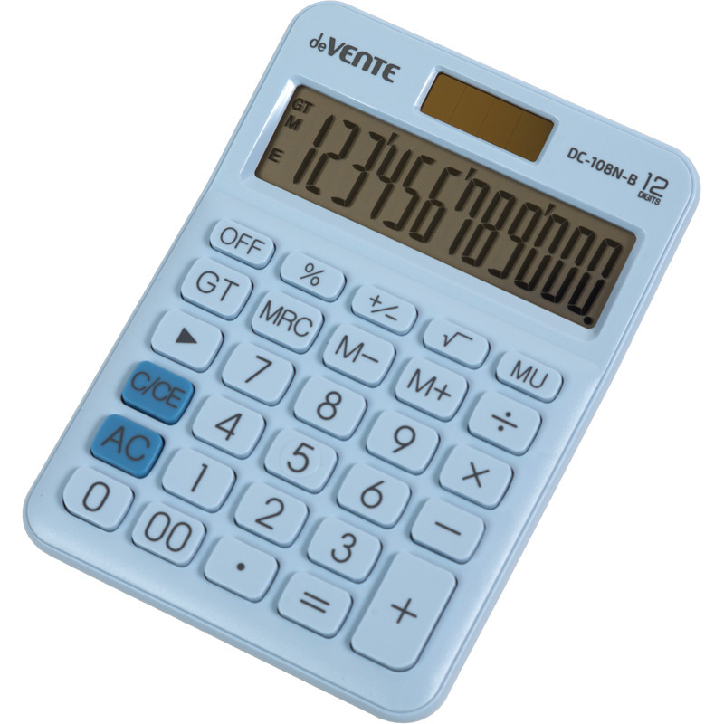 Калькулятор настольный "deVENTE" DC-108N-B, 98x136x31 мм, 12 разрядный, автоматическое вычисление процентов, квадратного корня, общая сумма, функция смены знака, коррекция последнего введенного значения, кнопка «00», работа с памятью, двойное питание, автоматическое отключение, прорезиненые ножки, пастельный голубой, в картонной коробке
