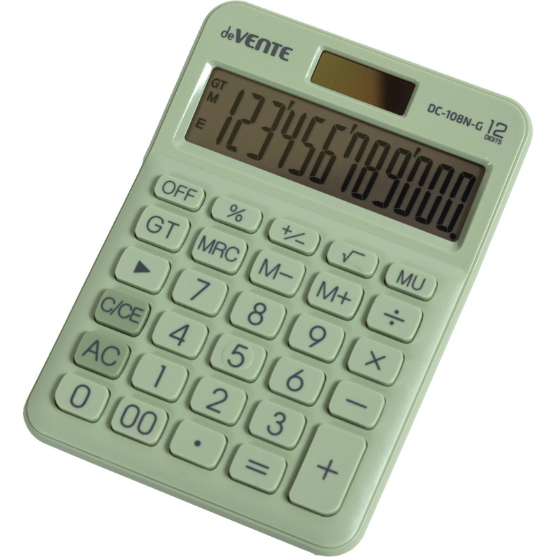 Калькулятор настольный "deVENTE" DC-108N-G, 98x136x31 мм, 12 разрядный, автоматическое вычисление процентов, квадратного корня, общая сумма, функция смены знака, коррекция последнего введенного значения, кнопка «00», работа с памятью, двойное питание, автоматическое отключение, прорезиненые ножки, салатовый, в картонной коробке