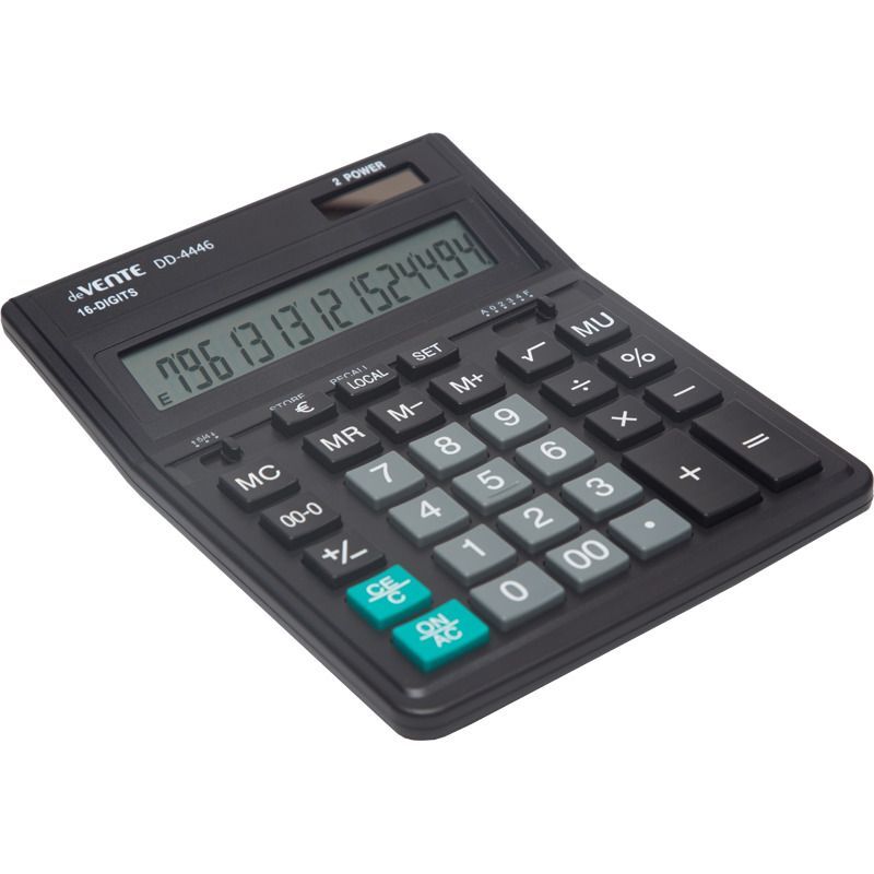Калькулятор настольный "deVENTE" DD-4446, 153x199x31 мм, 16 разрядный, двойное питание, автоматическое вычисление квадратного корня, процентов, наценки, автоматическая конвертация валют, клавиша "00" функция смены знака, коррекция последнего введенного значения, работа с памятью, автоматическое отключение, прорезиненные ножки, крупные клавиши, черный, в картонной коробке