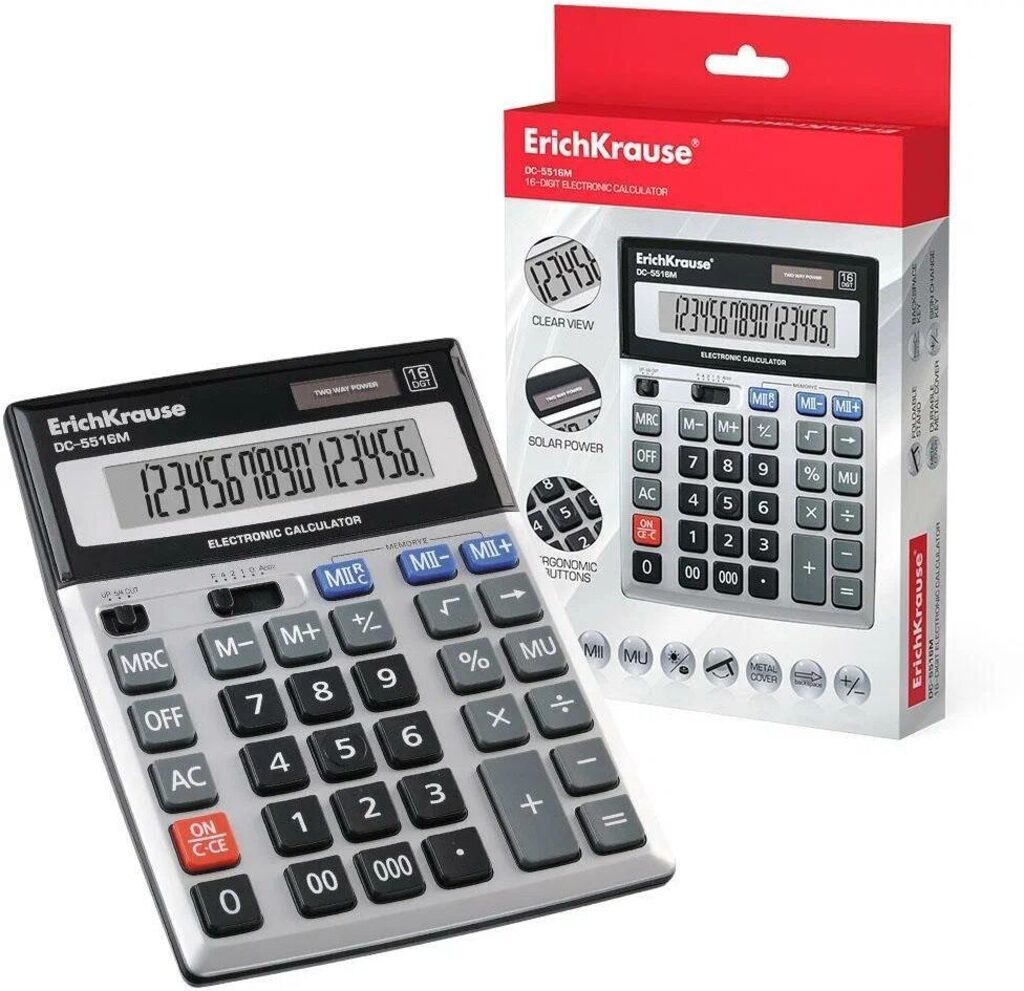 • 16-разрядный • Клавиша «00» и «000» • Пластмассовые клавиши • Солнечная батарея • Литиевая батарея питания • Двухуровневая память • Клавиша операции «повышение цены» • Клавиша знака числа • Клавиша удаления последней отображаемой цифры • Переключатель «Режим округления» • Переключатель «Количество знаков после запятой» • Складная подставка • Автовыключение питания • Акриловое покрытие • Алюминиевая вставка • Простые математические операции
