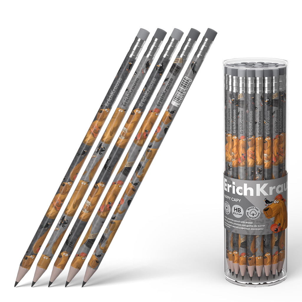 Круглый чернографитный карандаш из пластика с ударопрочным грифелем, твёрдость HB. Четыре дизайна корпуса карандаша, ластик серого цвета. Благодаря специальной технологии изготовления карандаша методом экструзии грифель надежно фиксируется к корпусу. Идеальная центровка грифеля гарантирует легкую заточку с экономным расходом карандаша. Грифель диаметром 2.2 мм не царапает бумагу и не крошится при рисовании. Ластик карандаша средней жесткости изготовлен из экологически чистого и гипоаллергенного материала термопластичной резины (TPR). Не содержит ПВХ. Длина 188 мм.