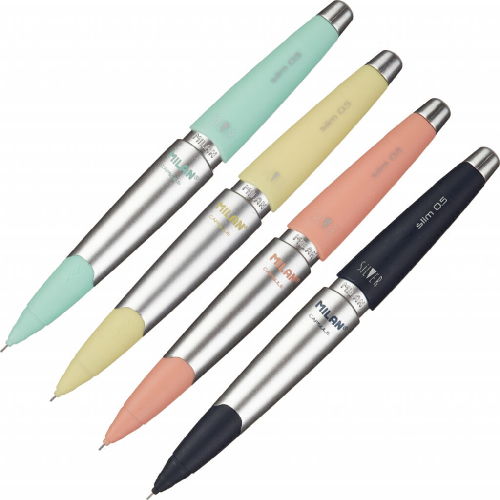 Карандаш механический Milan с оригинальном корпусом с выкручивающимся достаточно длинным ластиком, коллекция Capsule Silver Slim. Цвет металик средней части корпуса в сочетании с темно-синим , желтым, салатовым и розовым цветом нижней и верхней части . Толщина грифеля 0,5 мм , твердость HB. Размеры : 13x1,4x1,2 см. Доступны сменные грифели.Товар поставляется в нескольких вариантах цвета/дизайна (без возможности выбора).