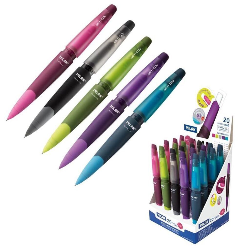 Механический карандаш и ластик Capsule Slim. Грифель карандаша 0,5 мм. создает сверхтонкие штрихи. Очень большой ластик Milan. Размеры тонкого механического карандаша: 13x1,4x1,2 см. Цвет товара представлен в ассортименте