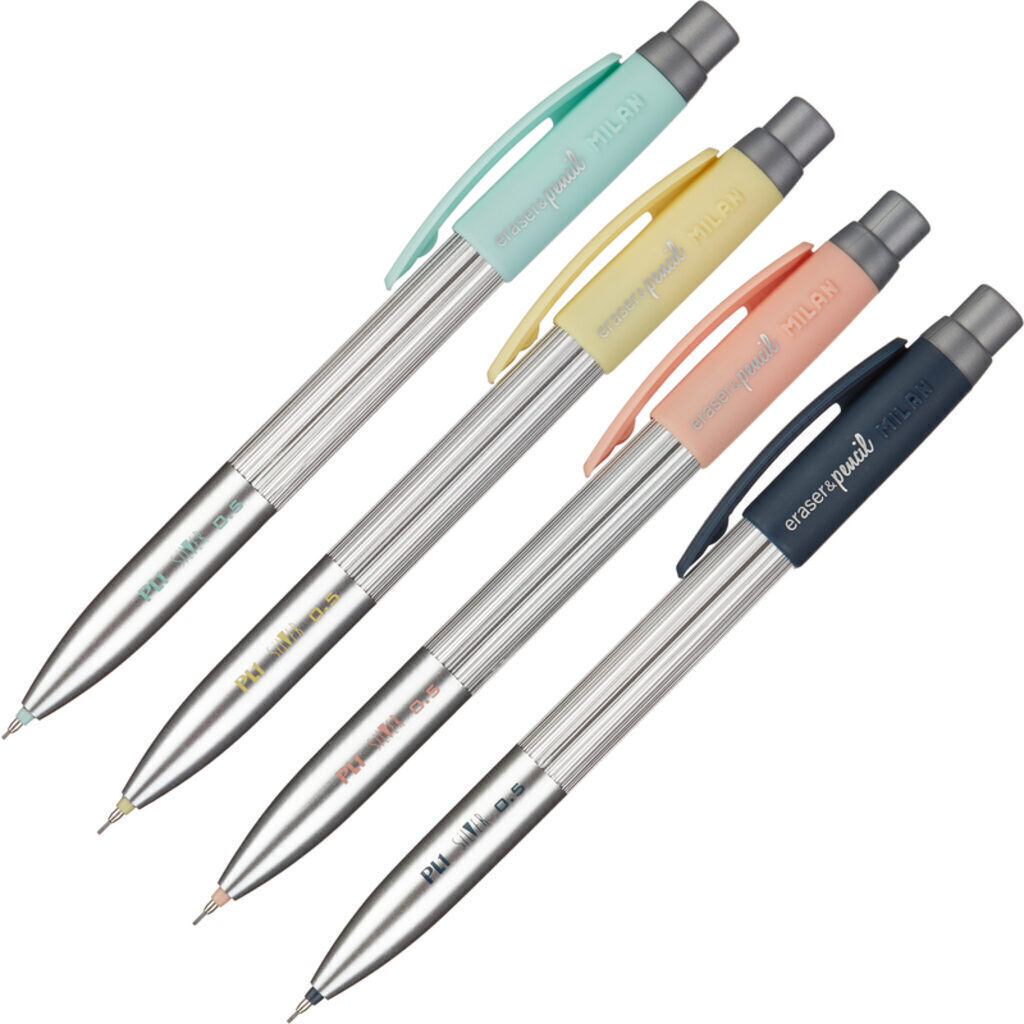 Карандаш механический Milan с оригинальным корпусом с выкручивающимся достаточно длинным ластиком, коллекция PL1 Silver. Цвет корпуса металлик в сочетании с темно-синим, желтым, салатовым или розовым цветом клипа.Толщина грифеля 0,5 мм, твердость HB.