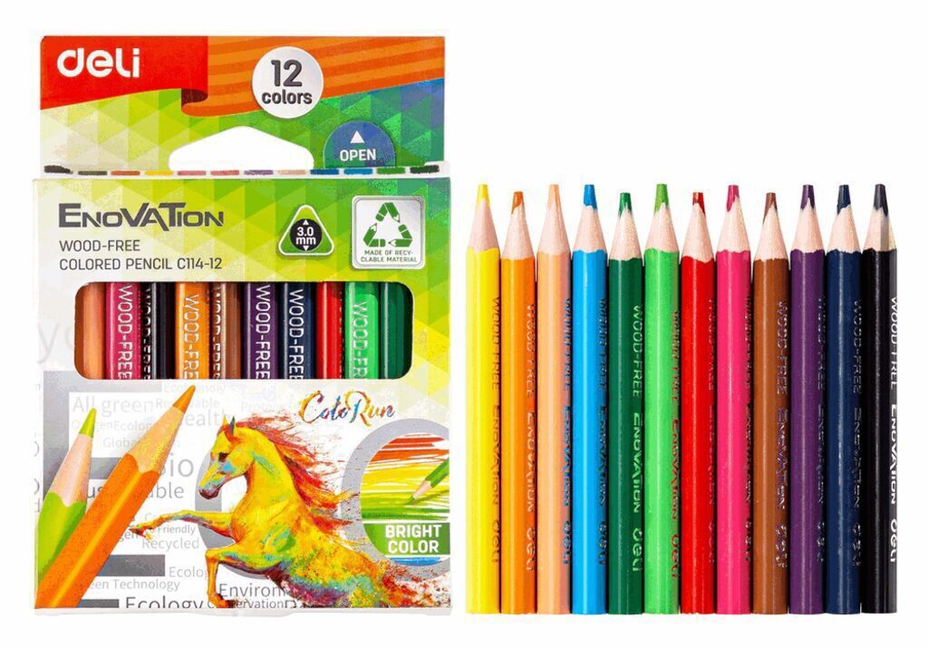 Карандаши цветные Deli EC114-12 Enovation трехгран. пластик 12цв. короткие коробка/европод. (12шт)