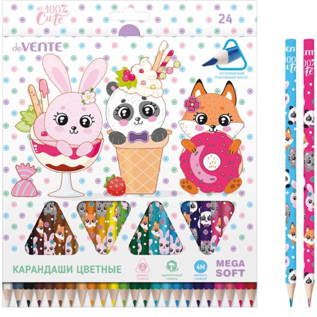 Карандаши цветные "deVENTE. 100% Cute" 24 цвета, 4М, диаметр грифеля 3 мм, трехгранный корпус c запечаткой, в картонной коробке