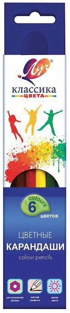 Корпус карандаша изготовлен из мягкой древесины тополя. При необходимости легко точатся обычной точилкой. Прочный грифель выдерживает хороший нажим и при этом не ломается и не крошится. Карандаши прекрасно пишут, имеют яркие, насыщенные цвета, хорошо смешиваются. Рисунок ложится на бумагу густо, сплошной чёткой линией. При производстве карандашей соблюдены все требуемые типоразмеры. Нет уменьшения диаметра корпуса или диаметра стержня с целью удешевления. Корпус карандаша окрашен в 18 покрытий, что делает его поверхность идеально гладкой и комфортной в работе. Благодаря качественной проклейке стержня и корпуса, стержень не ломается при падении. Все наборы поставляются в красивой картонной коробке с «окошком», на евро подвесе. В наборе 6 цветов: Черный, Коричневый, Красный, Желтый, Салатовый, Синий.