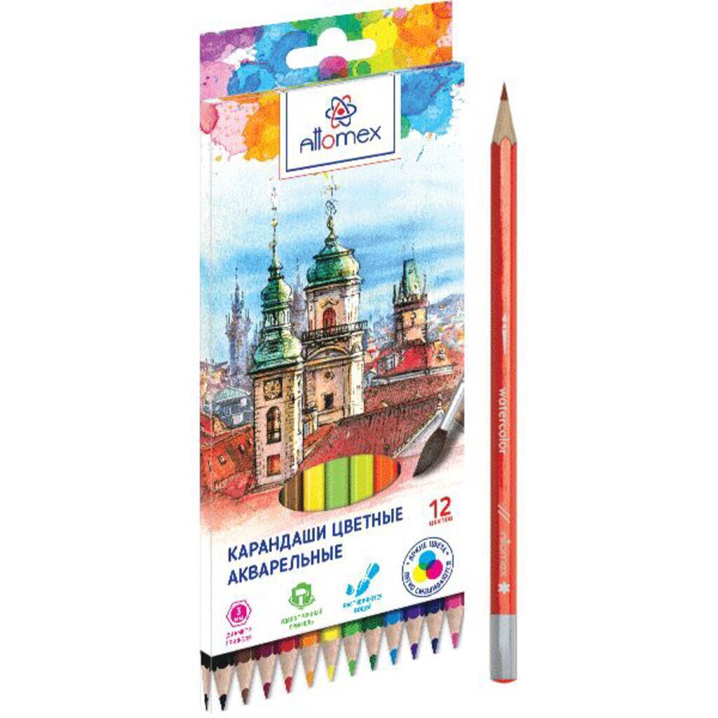 Карандаши цветные акварельные "Attomex" 12 цветов, М, диаметр грифеля 3 мм, шестигранные, в картонной коробке, Применение: Для получения эффекта акварели рисунок нужно размыть влажной кисточкой или рисовать карандашом по влажной бумаге. Без нанесения воды могут быть использованы как обычные цветные карандаши.