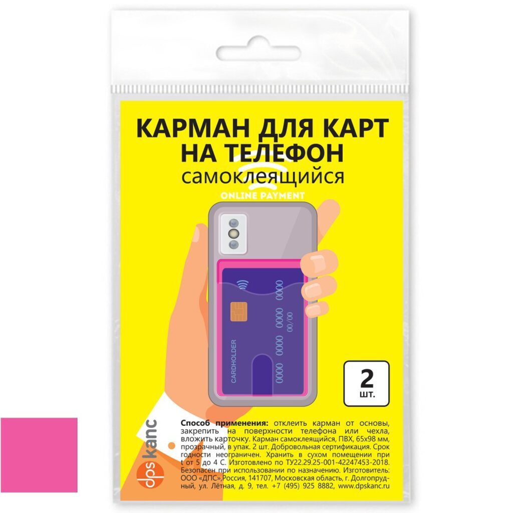 2969.С-521 Карман для карт на телефон, самоклеящийся, 65х98, розовый/прозрачный, в упак. 2 шт. Карман для двух карт или пропусков, самоклеящийся. Карман-картхолдер приклеивается к обратной стороне корпуса мобильного телефона или на его чехол. Удобно оплачивать или считывать не вынимаю карту или пропуск из кармана. Отличный аксессуар и нужная вещь для взрослых и детей. - Размер - 65 х 98 мм - Материал - ПВХ