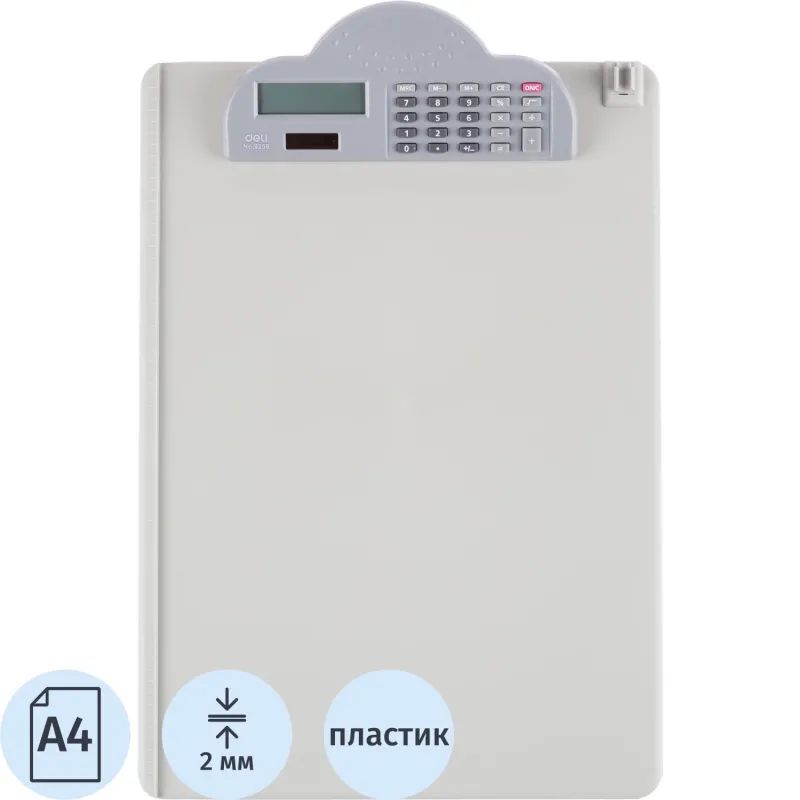 Новая, стильная папка-планшет Deli с калькулятором. Папка вертикальная клип-борд формата А4 изготовлена из прочного полипропилена, устойчива к царапинам и имеет гладкую поверхность. Используется для работы со счетами, накладными и другими документами. Незаменима при работе на складе, в магазине, при участии в конференциях, выставках и других публичных выступлениях, его можно взять в командировку, поездку. Прочный пластмассовый зажим для фиксации документов позволяет делать записи на весу. Сверху к планшету прикреплен держатель для ручки, наличие которого улучшает условия записи, а компактный, удобный, прочный и надежный калькулятор позволит вам быстро рассчитать все основные показатели. Он выполняет все основные статистические и математические расчеты. Папка-планшет фиксирует до 50 листов. Легкий и портативный, удобно носить в руках, легко помещается в сумке, портфеле, бизнес-кейсе.