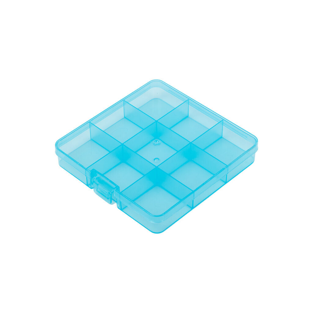 Коробка секционная квадратная со съемной защелкивающейся крышкой. Снабжена европетлей для подвешивания. Предназначается для хранения бисера, бусин и прочих мелочей для рукоделия и шитья.