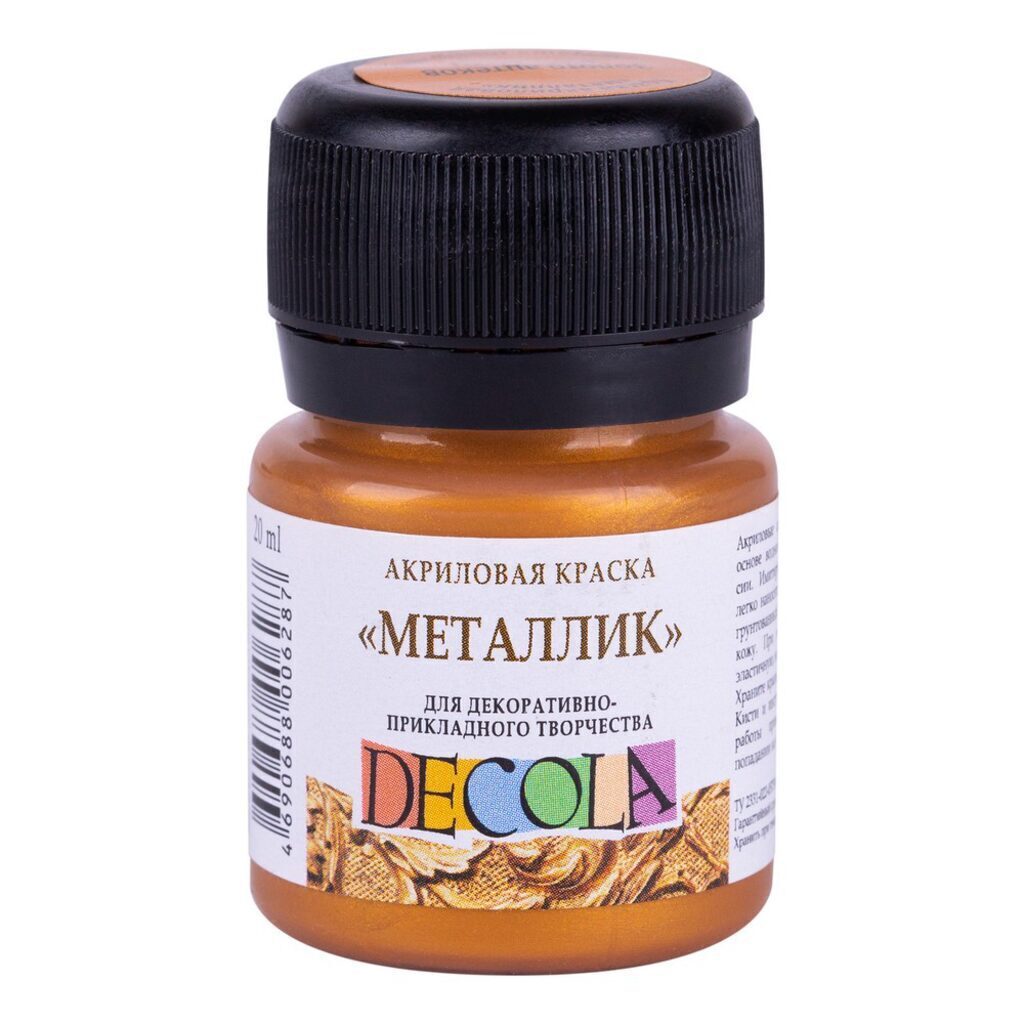 Акриловые краски металлик серии DECOLA - имитирующие цвета металлов воднодисперсные быстро сохнущие краски, содержащие суспензию пигмента в акриловой полимерной эмульсии, Их можно разбавлять водой, но после высыхания они становятся водостойкими. Вязкость акрила сравнима с вязкостью масляных красок. В зависимости от того, насколько акриловые краски разбавлены водой или модифицированы при помощи гелей или паст, акриловая живопись имеет свои уникальные характеристики, не достижимые для других художественных средств. Краски металлик серии DECOLA хорошо подходят для работы на таких поверхностях как холст, бумага, картон, стекло, дерево, металл, полотно, кожа. Краски непрозрачные, могут смешиваться с традиционными художественными красками для создания дополнительных красочных и фактурных эффектов. Не тускнеют, устойчивы к атмосферным воздействиям, светостойкие. Отличаются высокими покрывными свойствами.