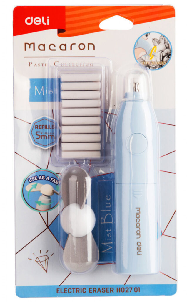 Ластик DELI Macaron EH02701 128x27x22 мм ассорти с вентилятором блистер, 12 шт 1205013 предназначен для удаления следов карандашей. Не царапает бумагу, поэтому безопасен в использовании. Устойчив к истиранию, за счет чего прослужит долго. Эргономичная форма ластика удобно лежит в руке. Товар поставляется в нескольких цветах без возможности выбора.