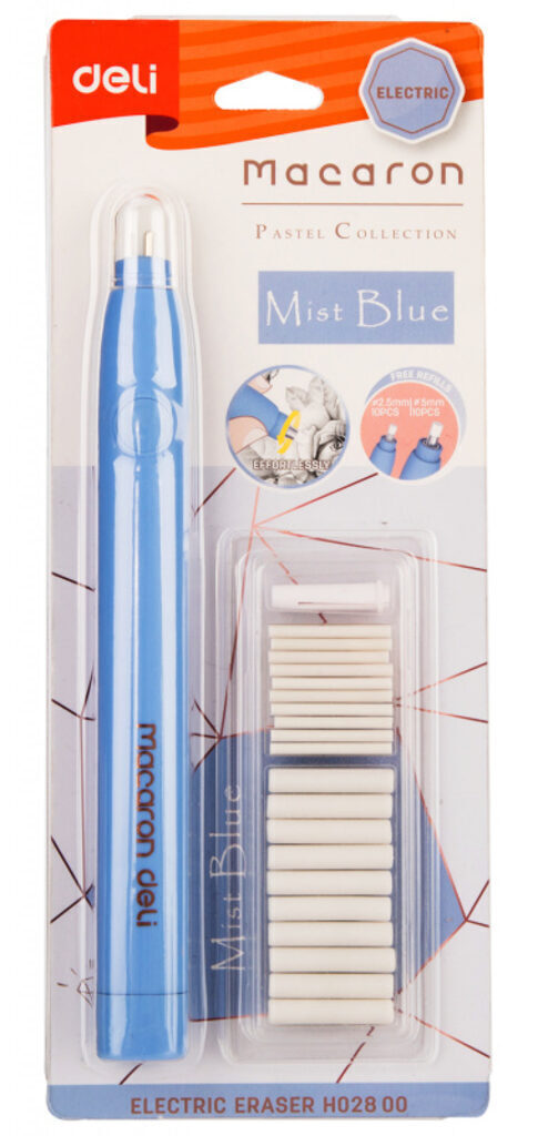 Электрический ластик Deli Macaron на батарейках ( 2хААА). Размер электрического ластика: 178х17х18 мм. Тип упаковки: блистер. Не содержит ПВХ, не токсичен.Можно использовать 2 типа ластиков по толщине. В комплекте 20 ластиков: 10шт диаметром 2.5мм и 10
