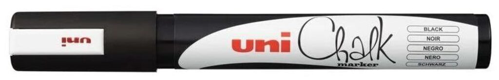 Меловой маркер Uni Chalk 5M (Юни Чак) с овальным наконечником, позволяет создавать линию от 1,8 до 2,5 мм. Основу красящего состава меловых маркеров Uni Chalk составляет специальный мел и полиакрилаты. Жидкая консистенция позволяет легко наносить меловую краску практически на любые гладкие поверхности: металл, пластик, стекло, камень и фарфор. После высыхания маркер легко стирается мокрой тряпкой, но в то же время защищен от воздействия влаги и осадков. Меловые маркеры Uni Chalk благодаря своему удобству и практичности могут применятся в различных сферах для всевозможных работ: в школе - для рисования на доске, в барах и кафе - для подписи ценников, создания вывесок и рекламы, на различных производствах - могут быть применены для маркировки деталей, в дизайне - для создания декора и поделок. По своей сути, Uni Chalk это тот же разноцветный мелок только в более удобной форме, которая не пачкает руки.