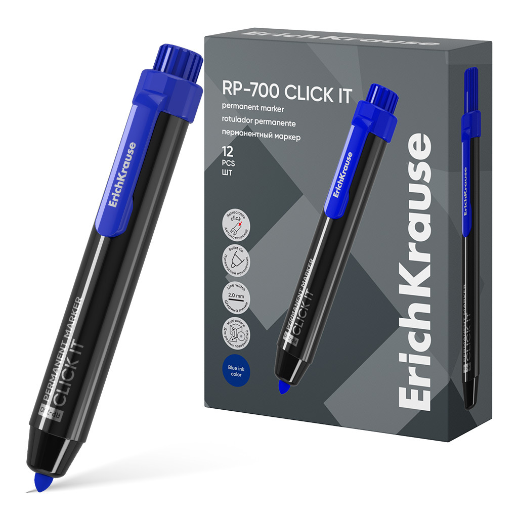 Автоматический перманентный маркер с наконечником пулевидной формы. Предназначен для письма и маркировки практически на всех поверхностях: бумага, картон, стекло, пластик, фарфор, дерево и др. Имеет круглую форму корпуса и цветной колпачок. Цвет колпачка соответствует цвету чернил. Наконечник устойчив к повреждению и истиранию. Толщина линии письма – 2.0 мм. Чернила на спиртовой основе, водоcтойкие, светостойкие, устойчивые к ультрафиолетовым лучам, быстро высыхают после нанесения. Не токсичны. Не содержат ксилол, толуол. Срок годности 5 лет.