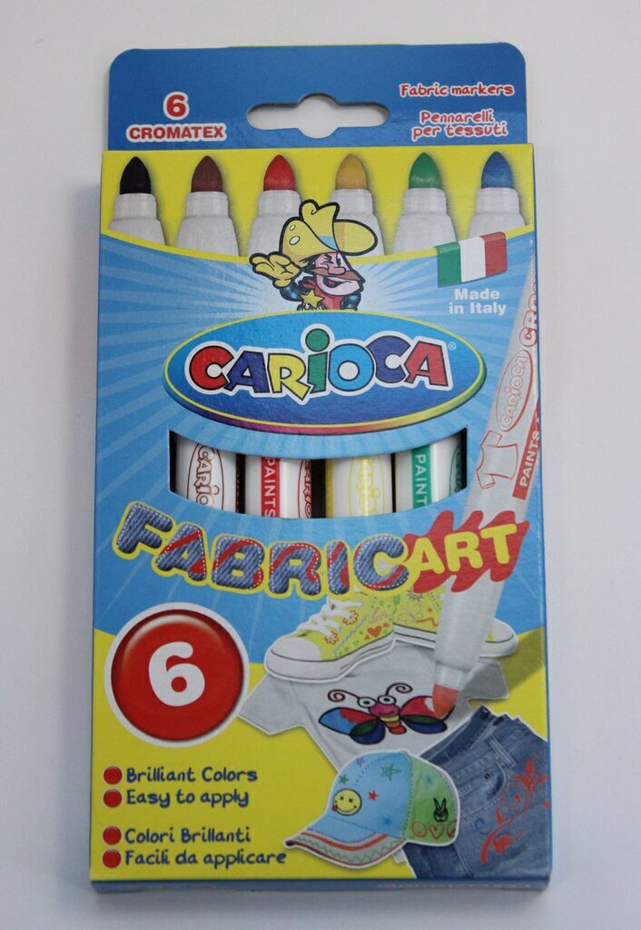 Фломастеры для ткани Carioca CROMATEX 6 цветов, коробка с европодвесом, набор маркеров с тонким пишущим узлом со специальными чернилами для ткани. Для большей устойчивости рекомендуется прогладить горячим утюгом нанесенное изображение. Вещи можно стирать в стиральной машине при температуре до 60 градусов..