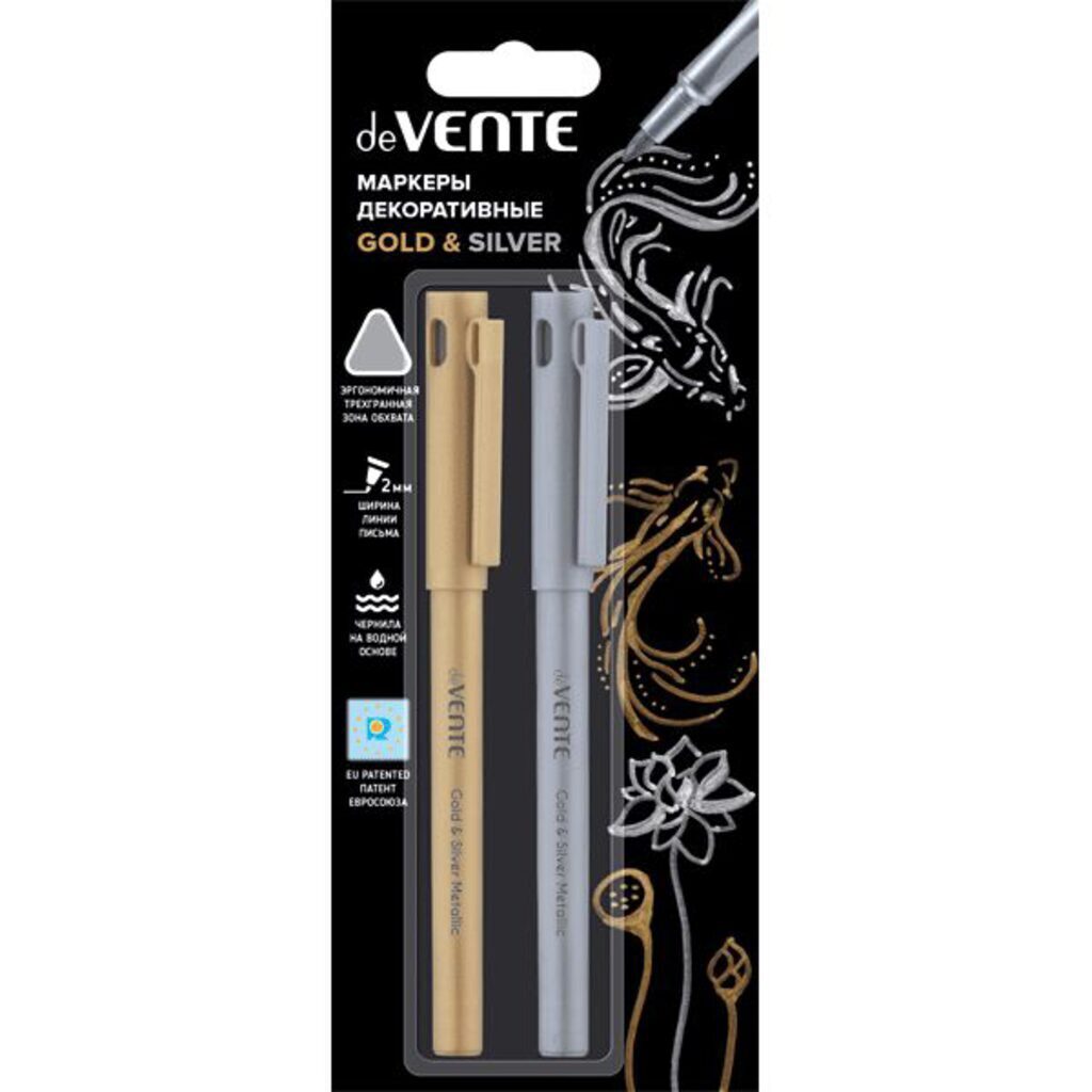 Набор декоративных маркеров "deVENTE. Gold & Silver" круглый корпус, пулевидный наконечник, ширина линии до 2 мм, трехгранный держатель, серебряный и золотистый, в картонном блистере