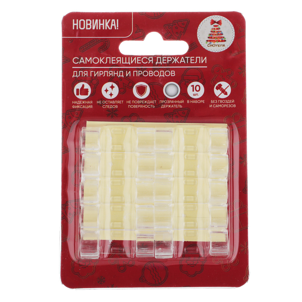 Держатели для гирлянд и проводов самоклеящиеся СНОУ БУМ предназначены для крепления гирлянд и проводов. Идеальное решение для крепления гирлянд в виде завесы, бахромы, водопада или сетки. Для монтажа держателей не потребуются гвозди и саморезы, а качественная клеевая основа обеспечивает надежную фиксацию, не оставляет следов на покрытии и не повреждает поверхность. Прозрачный держатель отлично удерживает провода и не виден на стене, поэтому гирлянда будет смотреться эстетично.