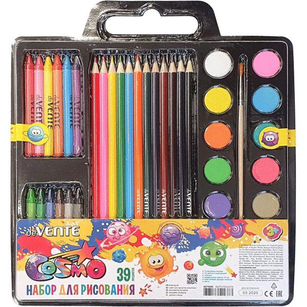 Набор для рисования подарочный "deVENTE. Cosmo" в наборе 39 пр: краски акварельные 12 цв, кисть, пластиковая крышка-палитра, карандаши цветные 12 цв, мелки восковые 12 цв, точилка, в пластиковой коробке с подвесом
