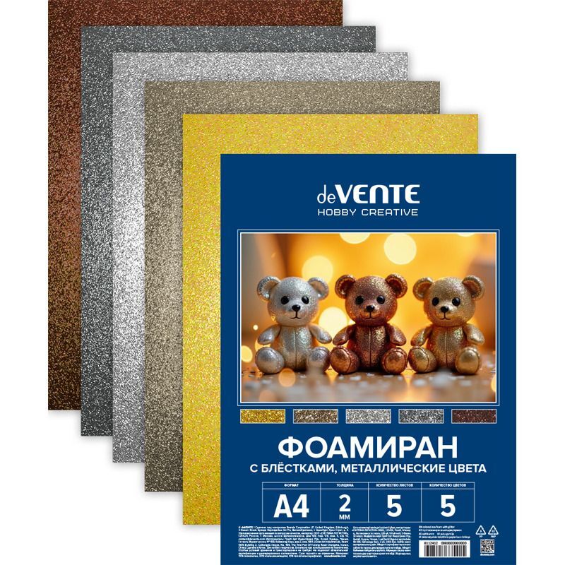 Фоамиран цветной с блёстками A4 "deVENTE. HOBBY CREATIVE. Металлические цвета" 5 цв, 5 л, толщина 2 мм, пластиковый пакет с европодвесом