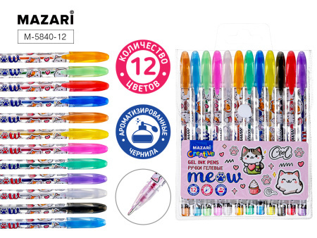 Набор ручек гелевых с блёстками MEOW с ароматизированными чернилами, 12 цветов, имеют пулевидный пишущий.узел 0.9 мм, корпус пластиковый цветной, в пвх-упаковке с европодвесом