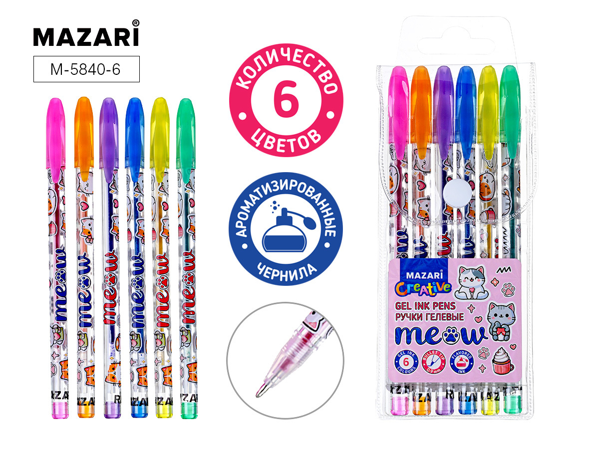 Набор ручек гелевых с блёстками MEOW с ароматизированными чернилами, 6 цветов, имеют пулевидный пишущий.узел 0.9 мм, корпус пластиковый цветной, в пвх-упаковке с европодвесом